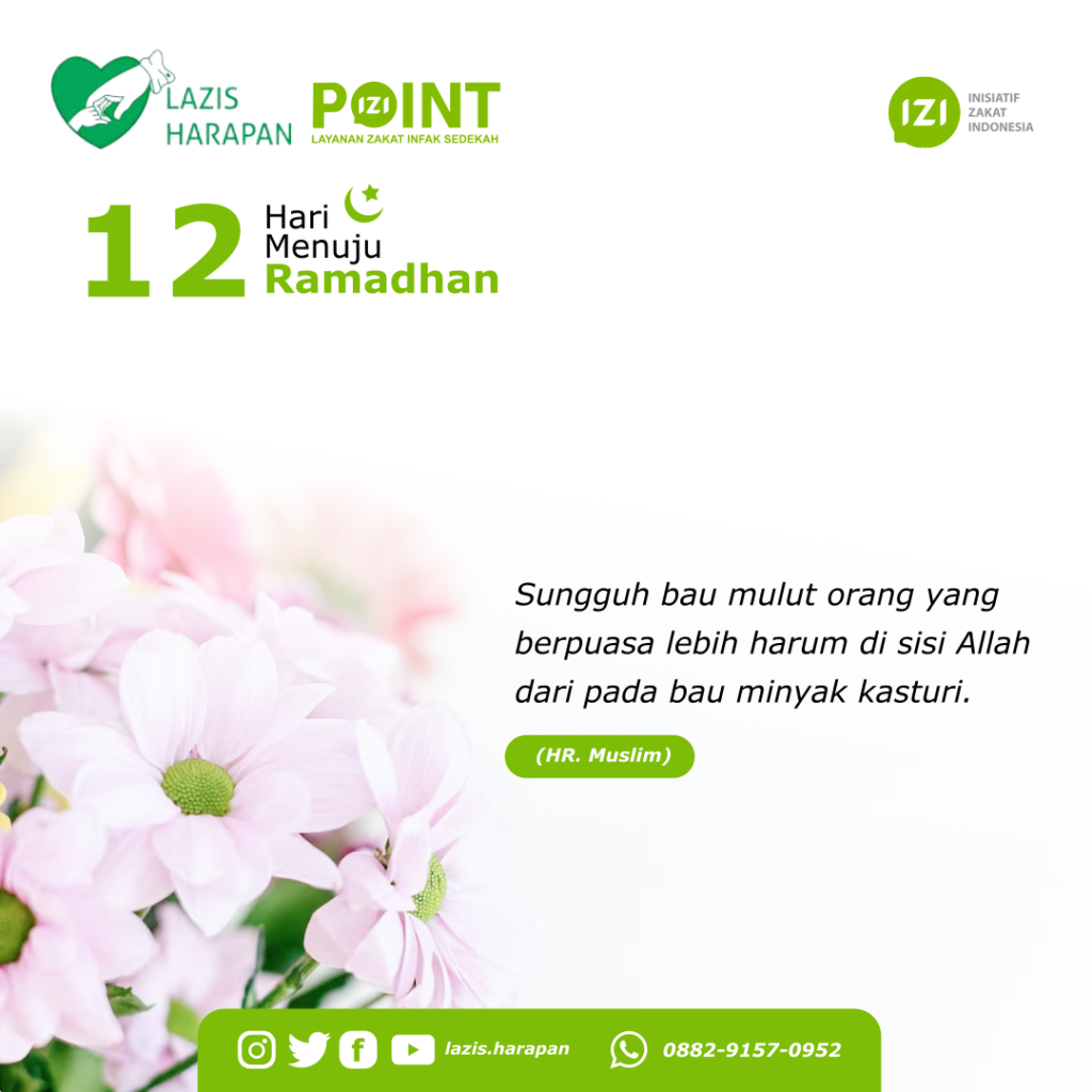 12 Hari Menuju Ramadhan Leave a Comment / Berita, LAZISHA / By Humas Ybi “Sungguh bau mulut orang yang berpuasa lebih harum di sisi Allah dari pada bau minyak kasturi.”(HR. Muslim)