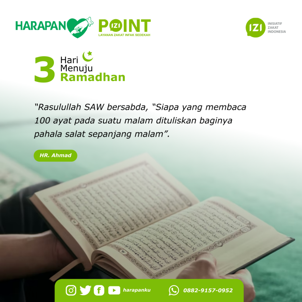 3 Hari Menuju Ramadhan Leave a Comment / Berita, LAZISHA / By Humas Ybi “Rasulullah SAW bersabda, “Siapa yang membaca 100 ayat pada suatu malam dituliskan baginya pahala salat sepanjang malam”.(HR. Ahmad)