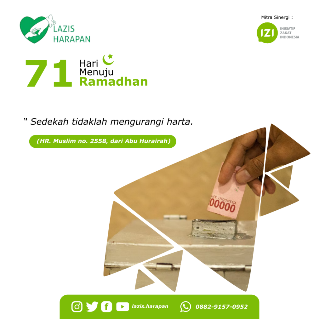 71 Hari Menuju Ramadhan Leave a Comment / Berita, LAZISHA / By Humas Ybi “Sedekah tidaklah mengurangi harta.”(HR. Muslim no. 2558, dari Abu Hurairah)