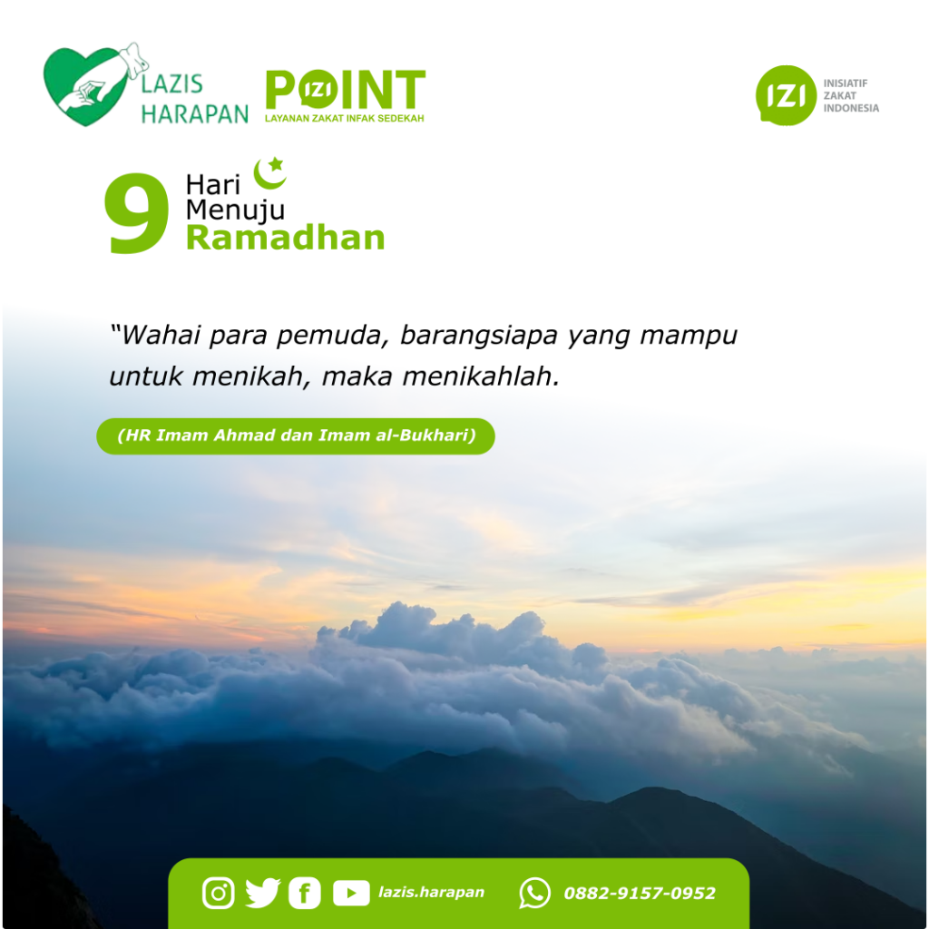 9 Hari Menuju Ramadhan Leave a Comment / Berita, LAZISHA / By Humas Ybi “Wahai para pemuda, barangsiapa yang mampu untuk menikah, maka menikahlah.”(HR Imam Ahmad dan Imam al-Bukhari)