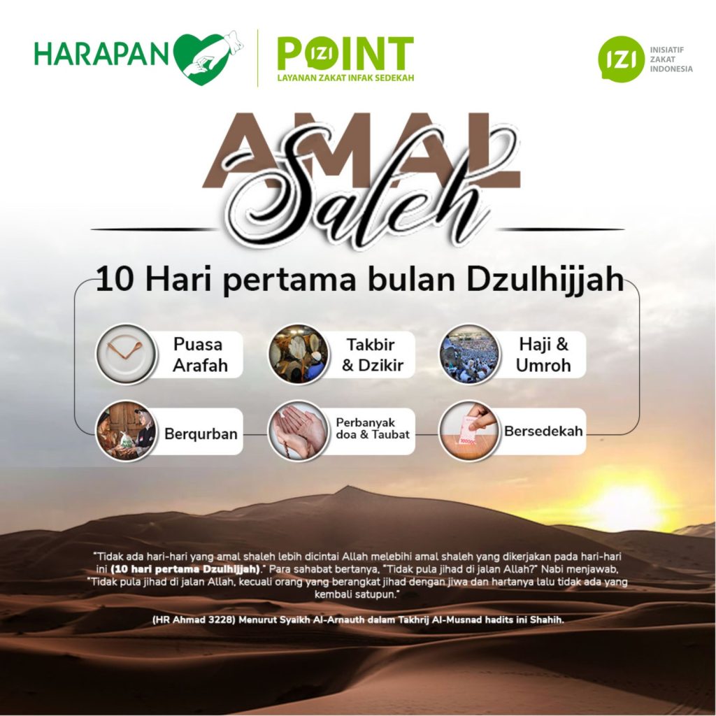 Dalam rangka menyambut bulan Dzulhijjah, Ayo kita semua memperbanyak amal shaleh, karena pahala dari apa yang kita kerjakan akan dilipatgandakan oleh Allah. Sebagaimana hadist Dari Ibnu Umar R.A, dari Nabi SAW bersabda,