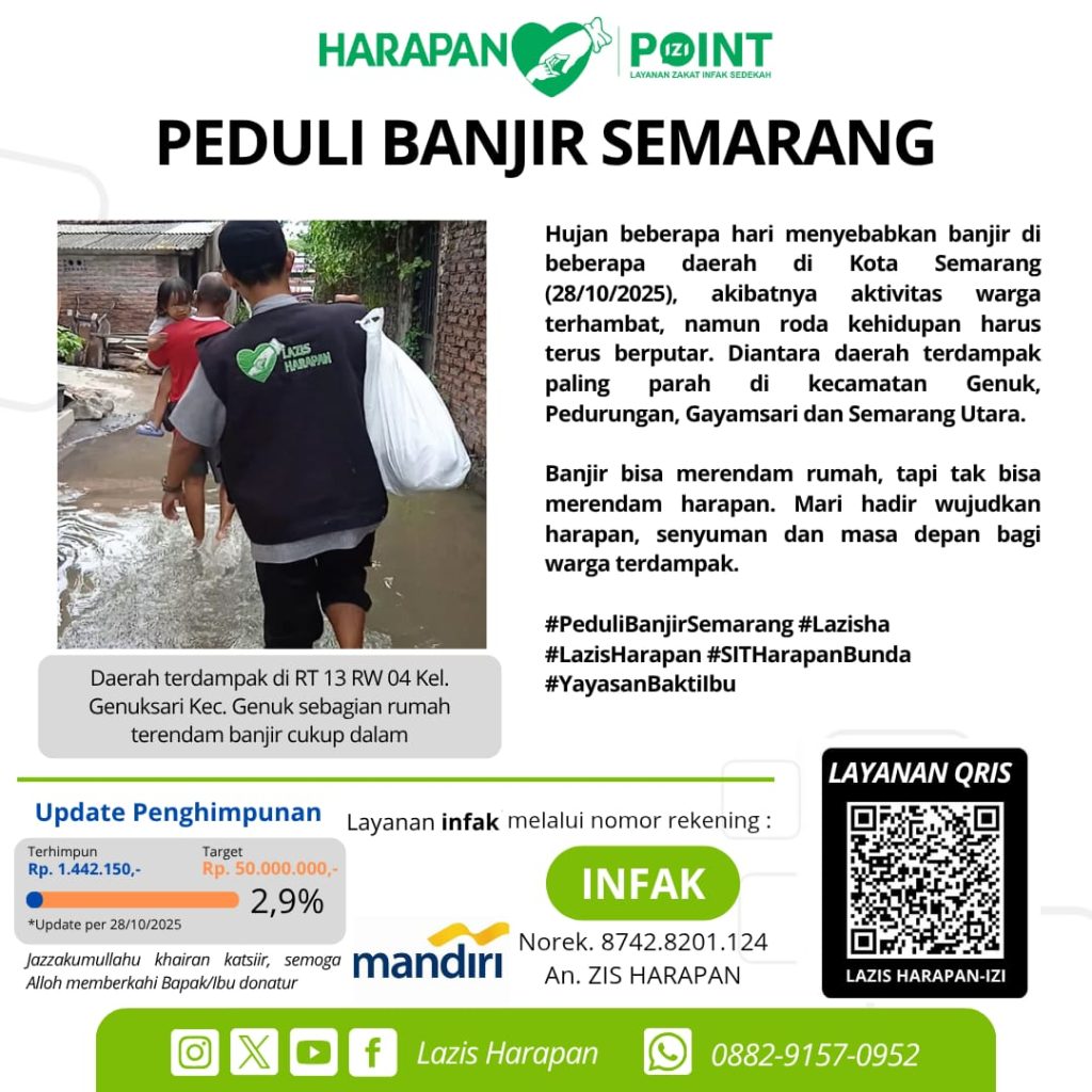 Peduli Banjir SemarangLazis Harapan@lazis.harapan Hujan beberapa hari menyebabkan banjir di beberapa daerah di Kota Semarang (28/10/2025), akibatnya aktivitas warga terhambat, namun roda kehidupan harus terus berputar. Diantara daerah terdampak paling para di Kecamatan Genuk, Pedurungan, Gayamsari dan Semarang Utara.Banjir bisa merendam rumah, tapi tak bisa merendam harapan. Mari hadir wujudkan harapan, senyuman dan masa depan …