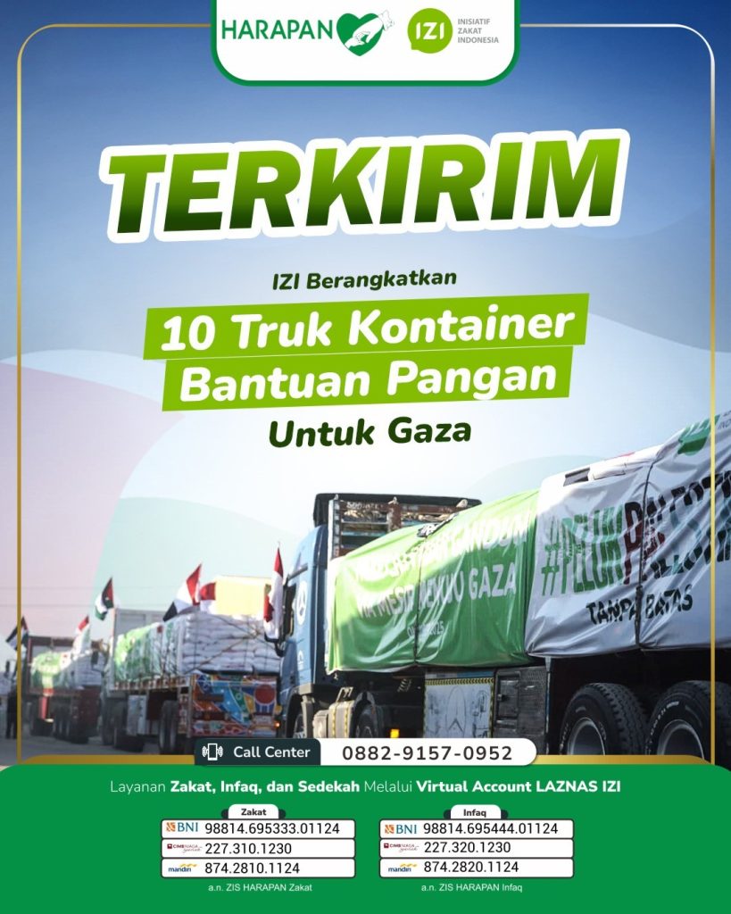 Alhamdulillah! Bantuan Amanah Donatur Melalui IZI untuk Gaza Telah Dikirim  Assalamu’alaikum, Sahabat! Alhamdulillah, atas amanah dan dukungan para donatur, muhsinin, dan mitra yang bekerjasama, pada 28 Oktober 2025 Inisiatif Zakat Indonesia (IZI) telah melepas 189,7 ton bantuan kemanusiaan untuk saudara-saudara kita di *Gaza, Palestina, melalui jalur *Ismailia – Mesir. Bantuan ini berisi kebutuhan pokok, obat-obatan, dan perlengkapan …