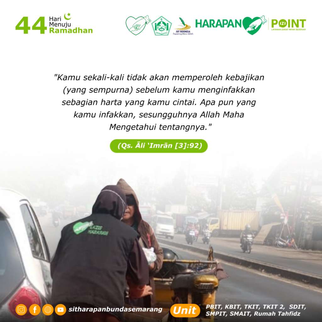 “Kamu sekali-kali tidak akan memperoleh kebajikan (yang sempurna) sebelum kamu menginfakkan sebagian harta yang kamu cintai. Apa pun yang kamu infakkan, sesungguhnya Allah Maha Mengetahui tentangnya.”