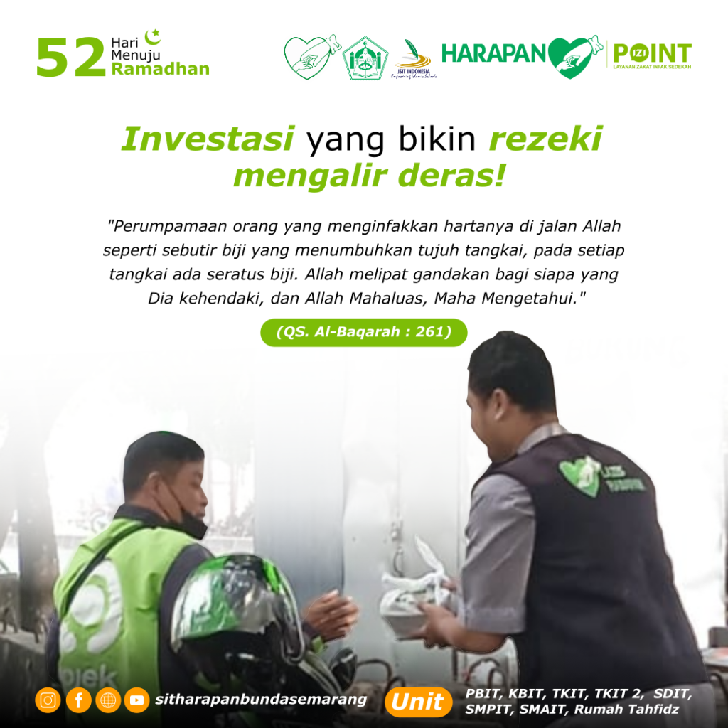 H-52 Ramadhan Leave a Comment / Berita, YBI / By Humas Ybi Investasi yang bikin rezekimengalir deras!“Perumpamaan orang yang menginfakkan hartanya di jalan Allah seperti sebutir biji yang menumbuhkan tujuh tangkai, pada setiap tangkai ada seratus biji. Allah melipat gandakan bagi siapa yang Dia kehendaki, dan Allah Mahaluas, Maha Mengetahui.”(QS. Al-Baqarah : 261)#ramadhan2025#jsitindonesia#rezekiberkah#jsitindonesia#berbagiituindah