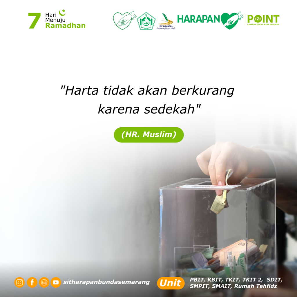 H-7 Ramadhan Leave a Comment / Berita, YBI / By Humas Ybi 7 Hari Menuju Ramadhan“Harta tidak akan berkurang karena sedekah”(HR. Muslim)