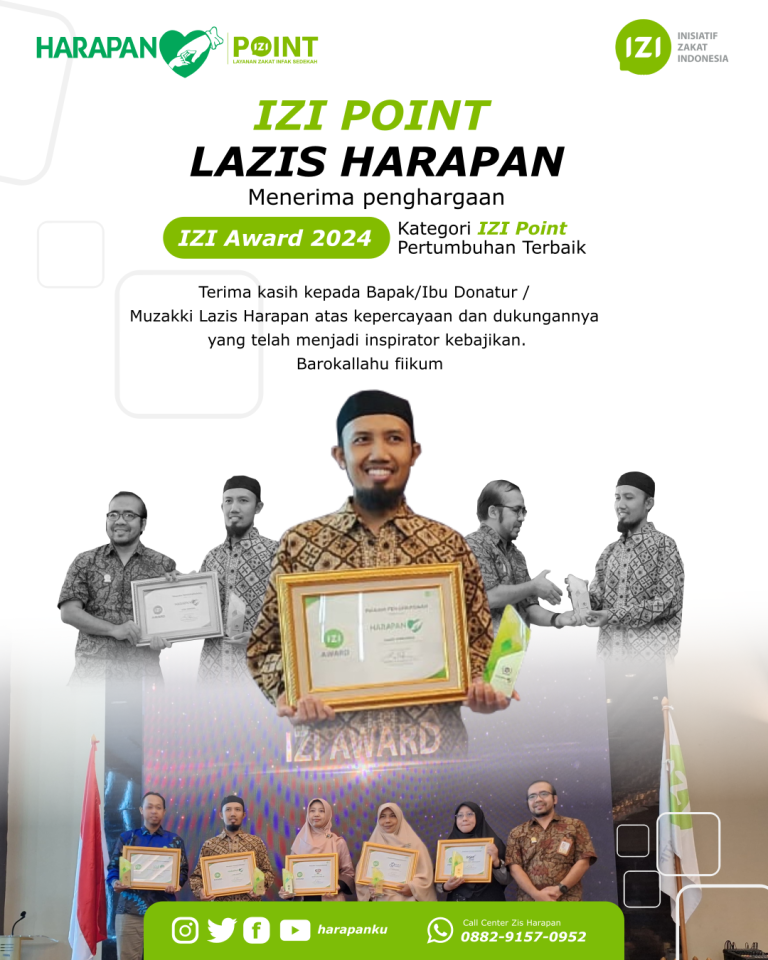 Terima kasih kepada IZI yang telah memberikan Penghargaan IZI AWARD 2024 dengan kategori IZI Point Pertumbuhan Terbaik. Semoga terus menjadi inspirator kebajikan.