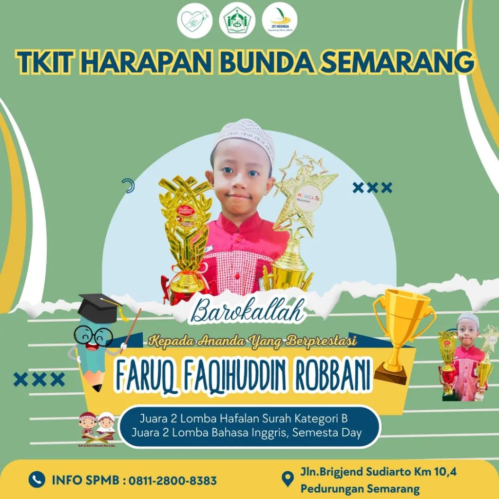 Prestasi KBIT – TKIT Th 2025 Leave a Comment / Semua Prestasi, Siswa / By Humas Ybi KBIT-TKIT Harapan Bunda Semarang@kb_tkitharapanbundasemarang BarokallahAnak sholih atas prestasisnyaAnanda Faruq Faqihuddin Robbani Kelas TK B 1. Juara 2 Lomba Hafalan Surah Kategori B2. Juara 2 Lomba Bahasa Inggris, Semesta Day #anakhebatindonesia #anaksholehdansholehah