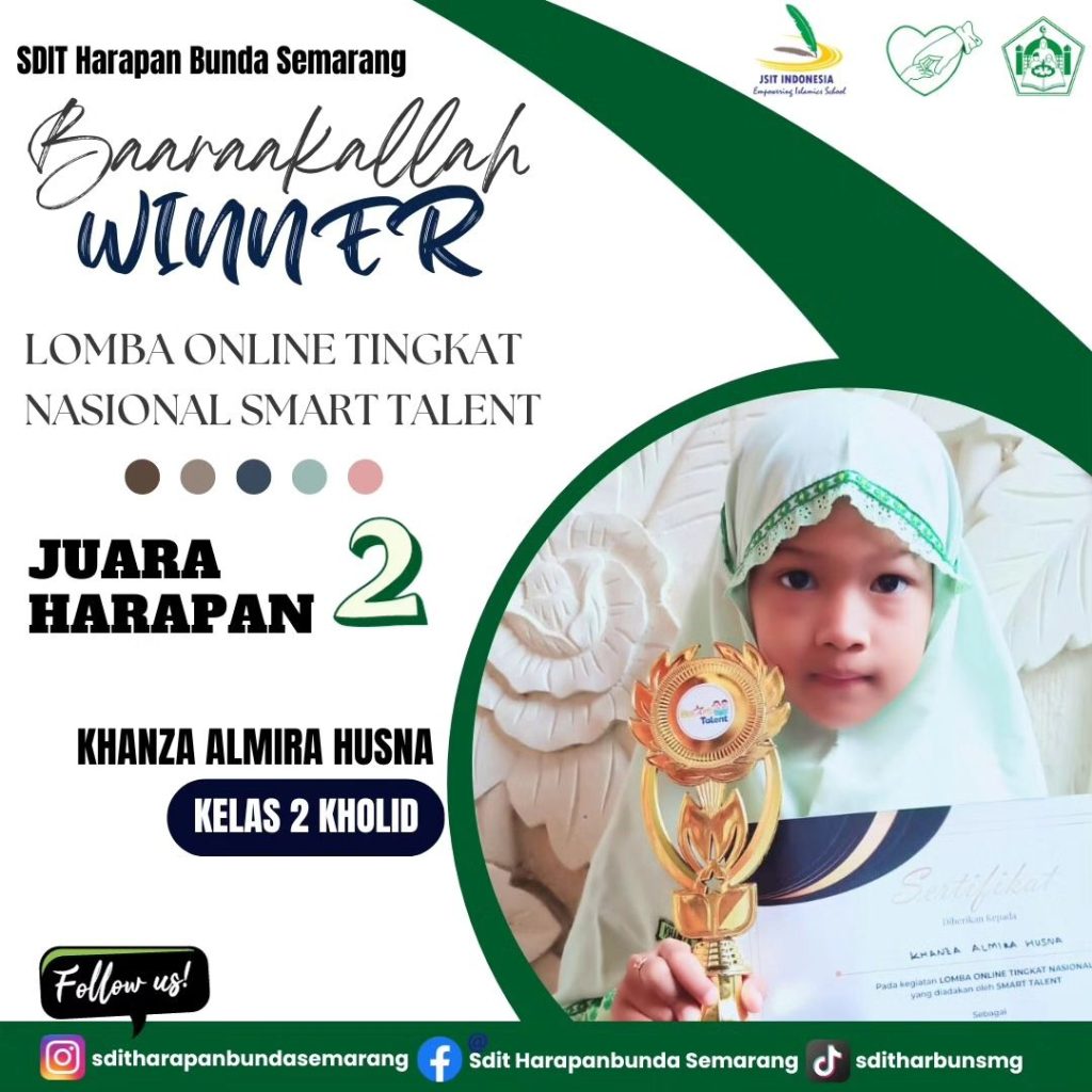 Prestasi SDIT Harapan Bunda Semarang Th 2023 Leave a Comment / Semua Prestasi, Siswa / By Humas Ybi Barakallah Fiikum kepadaKhanza Almira Husna (Kelas 2 Kholid)yang telah meraihJuara 2Lomba Online Tingkat Nasional SMART TALENTSemoga prestasi yang diraih dapat menginspirasi siswa-siswi SDIT Harapan Bunda Semarang untuk semakin bersemangat dalam berkarya _Aamiin_