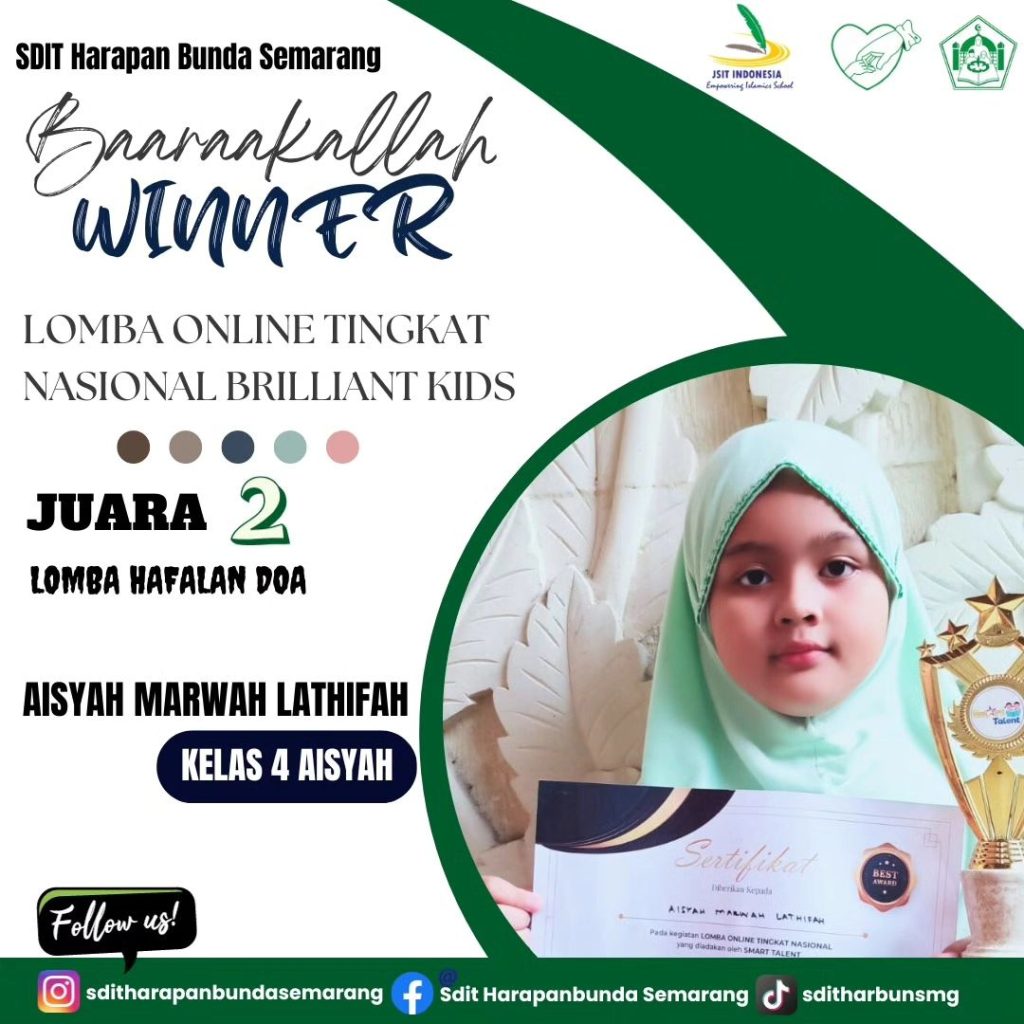 Barakallah Fiikum kepada Aisyah Marwah Lathifah (Kelas 4 Aisyah) yang telah meraih