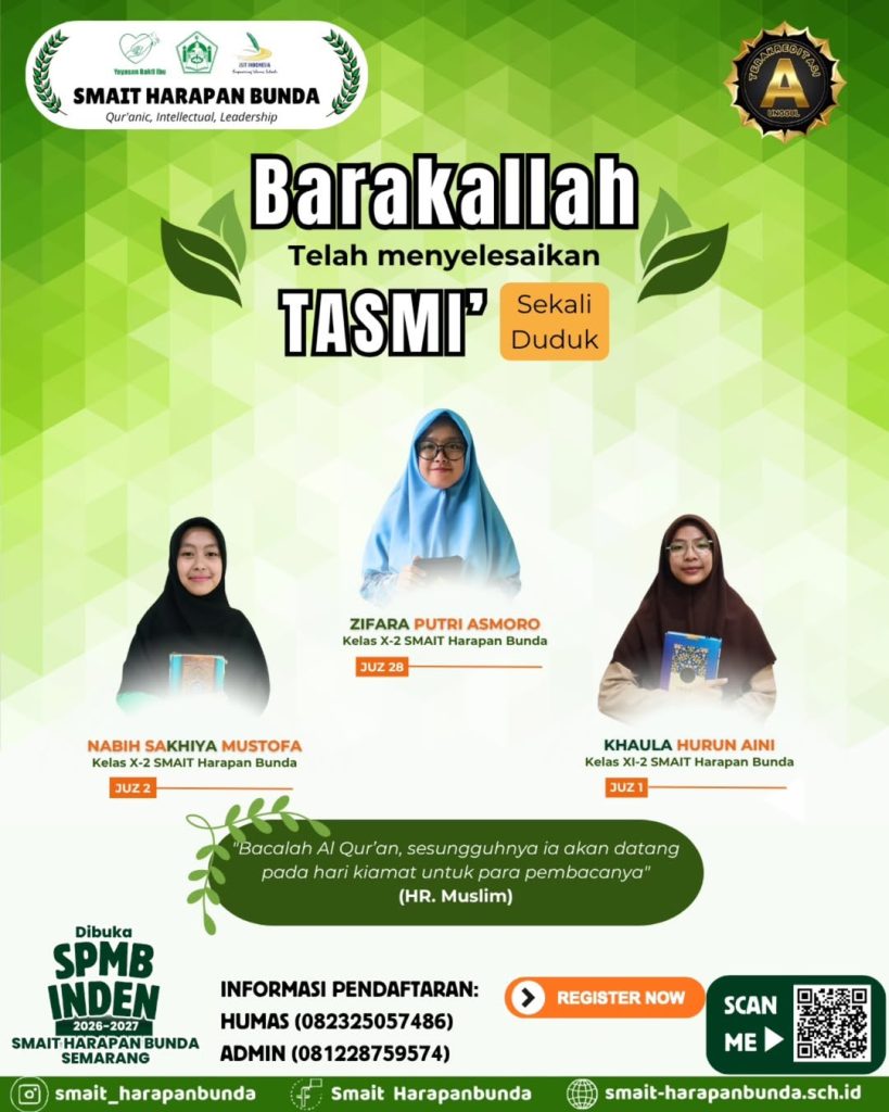 Mau menjadi penghafal Qur’an seperti kak Khiya, kak Zifara, dan kak Khaula? Yuk bergabung menjadi santri Rumah Tahfidz Nurul Qur’an dan bersekolah di SMAIT Harapan Bunda Semarang.