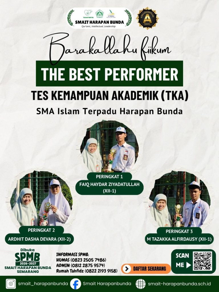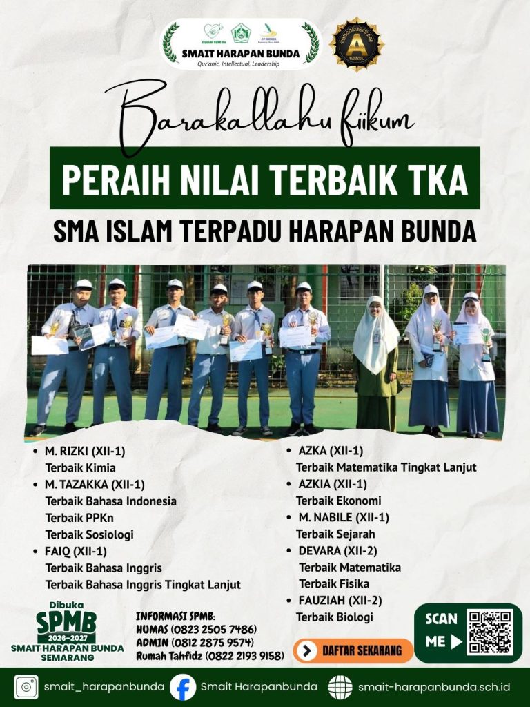 Alhamdulillah, inilah wajah-wajah peraih nilai tertinggi dalam Tes Kemampuan Akademik (TKA) SMA Islam Terpadu Harapan Bunda.
