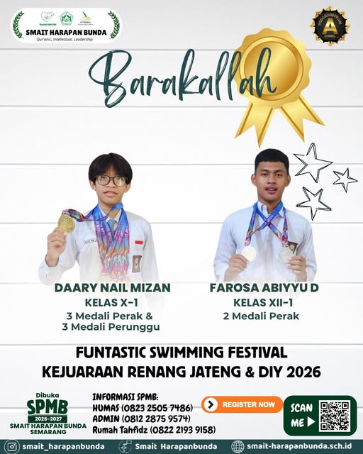 Barakallahu fiikum kepada para siswa SMA Islam Terpadu Harapan Bunda Semarang yang meraih juara pada Funtastic Swimming Festival Kejuaraan Renang Jateng & DIY 2026.