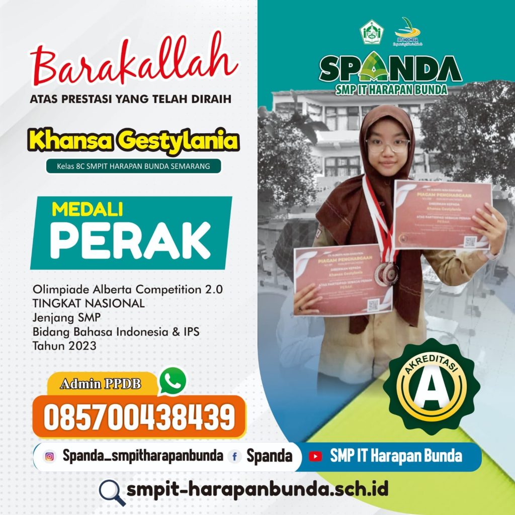 Prestasi SMPIT Harapan Bunda Semarang Th 2023 Leave a Comment / Semua Prestasi, Siswa / By Humas Ybi Assalamualaikum Wr WbBarakallah Fiikum kepada ananda yang telah meraih :⭐Medali Perak Tingkat NasionalKhansa Gestylania 8CSemoga prestasi yang diraih dapat menginspirasi siswa-siswi SPANDA untuk semakin bersemangat untuk berprestasi. AamiinWassalamualaikum Wr Wb