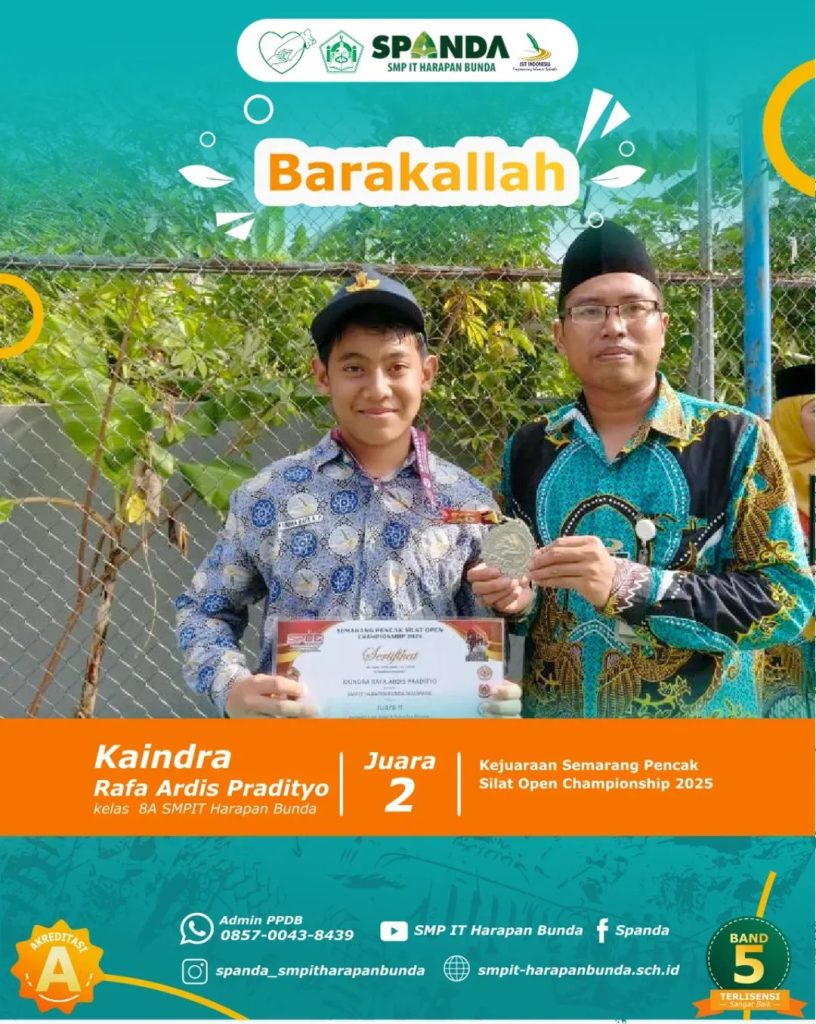 Prestasi SMPIT Th 2025 Leave a Comment / Semua Prestasi, Siswa / By Humas Ybi _Assalamualaikum Wr Wb_Barakallah Fiikum kepadaKaindra Rafa Ardis PradityoKelas 8A🥇Juara 2Kejuaraan Semarang Pencak Silat Open Championship 2025Semoga prestasi yang diraih dapat memotivasi siswa-siswi SPANDA untuk semakin bersemangat dalam berkarya _Aamiin__Wassalamualaikum Wr Wb_