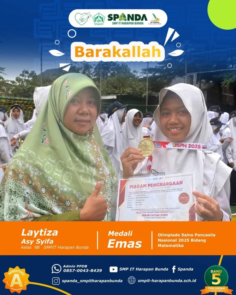 Prestasi SMPIT Th 2025-2026 Leave a Comment / Semua Prestasi, Siswa / By Humas Ybi _Assalamualaikum Wr Wb_Barakallah Fiikum kepadaLaytiza As SyifaKelas 9B🥇Medali EmasOlimpiade Sains Pancasila Nasional 2025 Bidang MatematikaSemoga prestasi yang diraih dapat memotivasi siswa-siswi SPANDA untuk semakin bersemangat dalam berkarya _Aamiin__Wassalamualaikum Wr Wb_