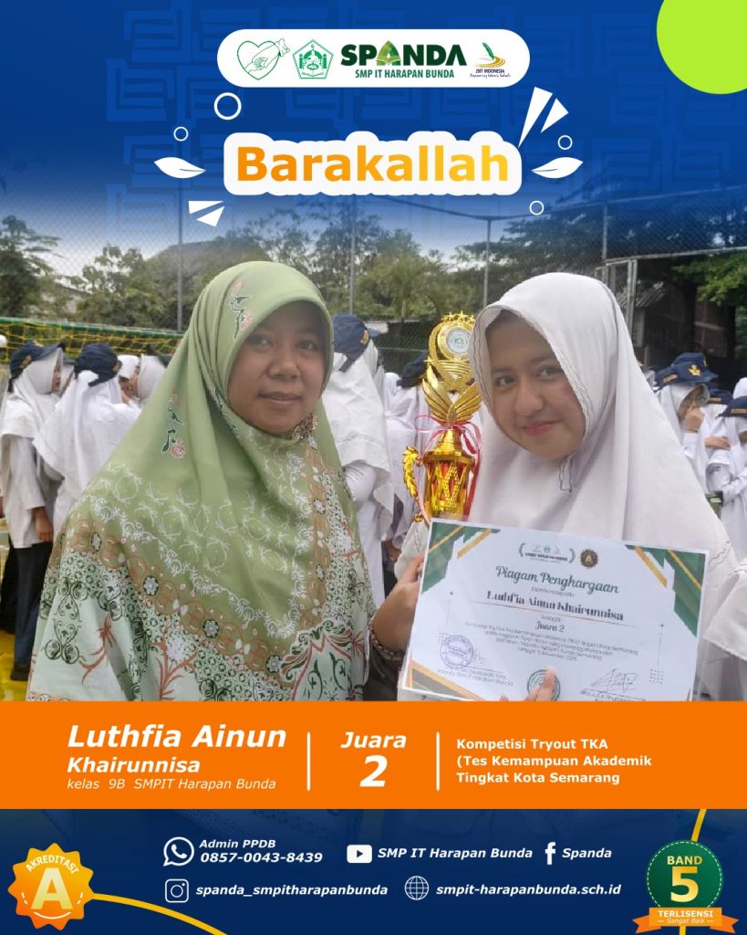 Prestasi SMPIT Th 2025 Leave a Comment / Semua Prestasi, Siswa / By Humas Ybi _Assalamualaikum Wr Wb_Barakallah Fiikum kepadaLuthfia Ainun KhairunnisaKelas 9B🥇Juara 2Kompetisi Tryout TKA(Tes Kemampuan Akademik) Tingkat Kota SemarangSemoga prestasi yang diraih dapat memotivasi siswa-siswi SPANDA untuk semakin bersemangat dalam berkarya _Aamiin__Wassalamualaikum Wr Wb_