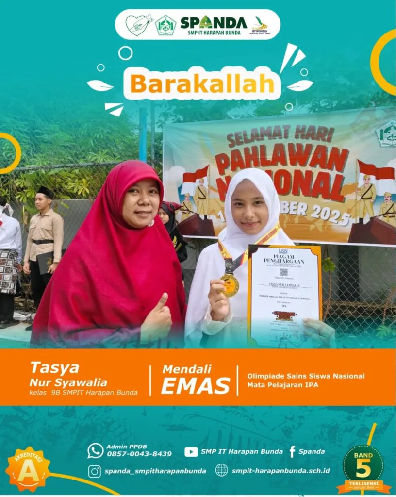 Prestasi SMPIT Th 2025 Leave a Comment / Semua Prestasi, Siswa / By Humas Ybi INFO PRESTASI Th 2025-2026SMPIT Harapan Bunda Semarang@spanda_smpitharapanbunda _Assalamualaikum Wr Wb_Barakallah Fiikum kepadaTasya Nur SyawaliaKelas 9BMedali Emas Olimpiade Sains Siswa Nasional Mata Pelajaran IPA Semoga prestasi yang diraih dapat memotivasi siswa-siswi SPANDA untuk semakin bersemangat dalam berkarya _Aamiin__Wassalamualaikum Wr Wb_