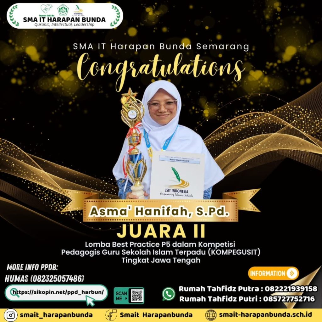Terimkasih kami sampaikan kepada Ustadzah Asma Hanifah, S.Pd. yang menjadi PJ proyek dan mewakili kota Semarang pada lomba Best Practice P5 tingkat Jawa Tengah yang meraih. Juga kami sampaikan terima kasih kepada Bapak/Ibu Guru Tim P5 yang telah mendampingi P5 bersama para peserta didik.