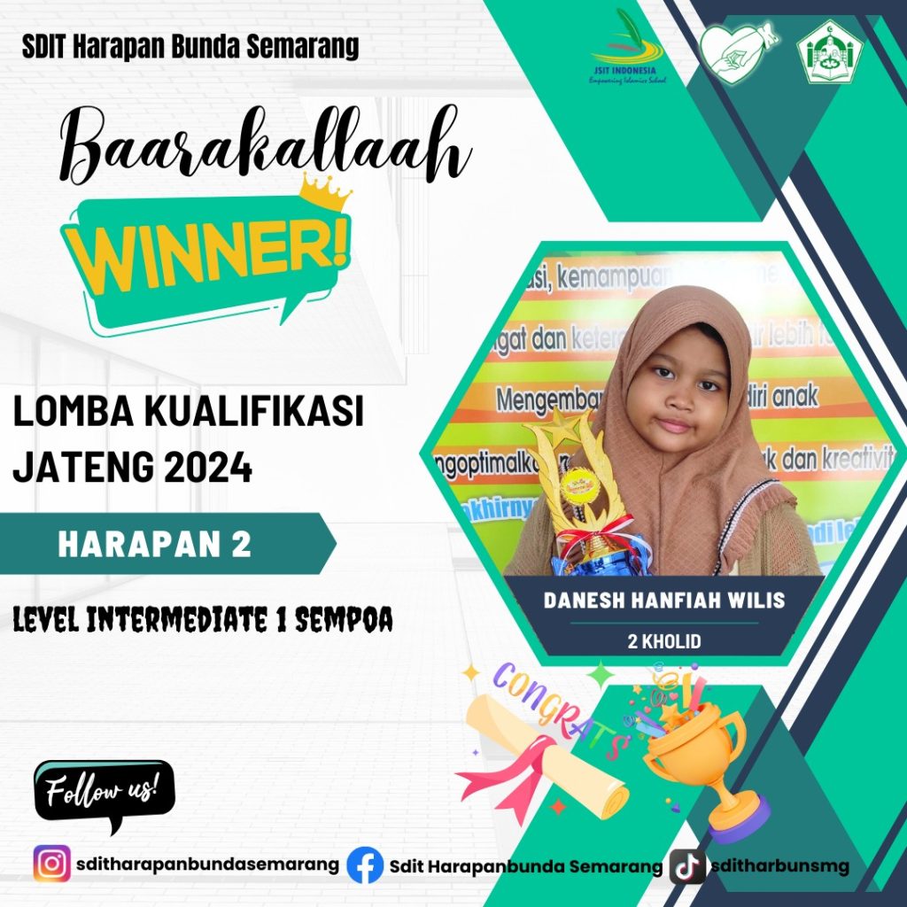 Prestasi Th 2024 Leave a Comment / Semua Prestasi, Siswa / By Humas Ybi Assalamualaikum Wr WbBarakallah Fiikum kepada ananda yang telah meraih :Danesh Hanfiah Wilis (2 Kholid)Harapan 2Level Intermediate 1 SempoaLomba Kualifikasi JATENG 2024Semoga prestasi yang diraih dapat menginspirasi siswa-siswi SDIT Harapan Bunda Semarang untuk semakin bersemangat untuk berprestasi. AamiinWassalamualaikum Wr Wb