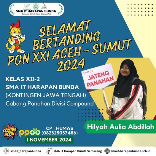 Prestasi Th 2024 Leave a Comment / Semua Prestasi, Siswa / By Humas Ybi Selamat kami sampaikan kepada ananda Hilyah Aulia Abdillah, siswi kelas XII-2 SMA IT Harapan Bunda, yang terpilih sebagai kontingen Jawa Tengah untuk cabang panahan divisi compound di PON XXI Aceh-Sumut 2024. Kita doakan yang terbaik!