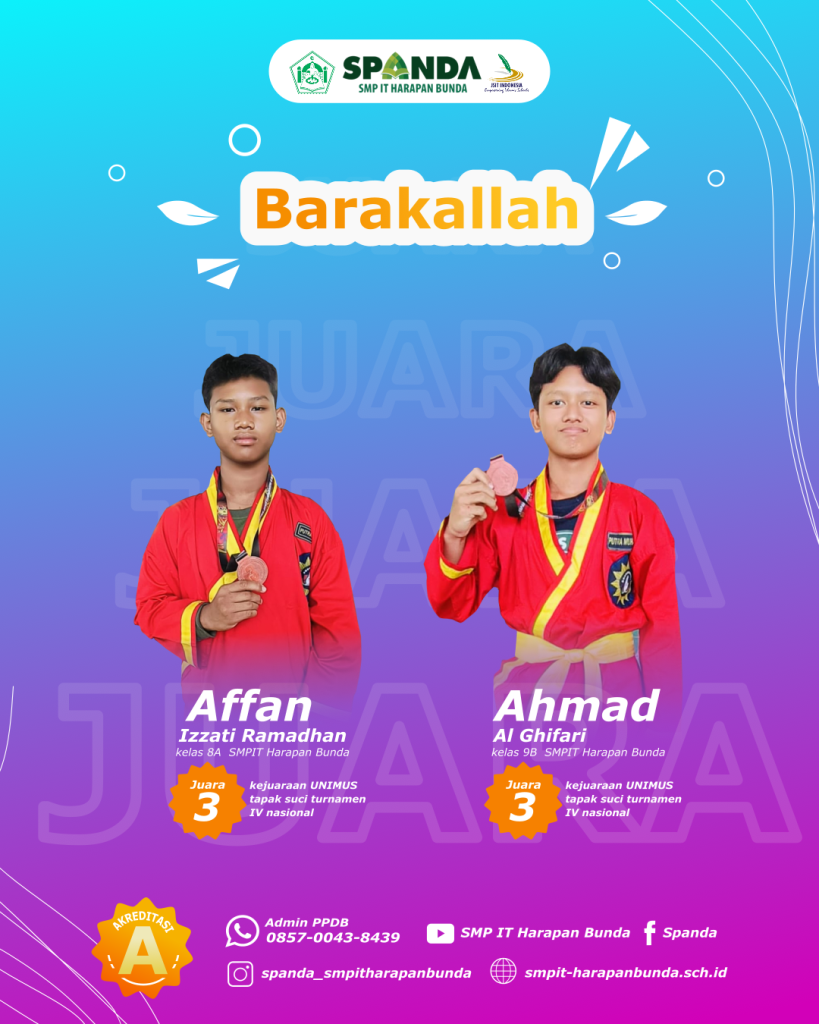 Prestasi Th 2024 Leave a Comment / Semua Prestasi, Siswa / By Humas Ybi _Assalamualaikum Wr Wb_Barakallah Fiikum kepada :🥉 *Affan Izzati Ramadhan* kelas 8A *sebagai Juara 3*🥉 *Ahmad Al Ghifari* Kelas 9B *sebagai Juara 3*Dalam ajang *Kejuaraan tapak suci turnamen IV nasional*Semoga prestasi yang diraih dapat memotivasi siswa-siswi SMPIT Harapan Bunda Semarang untuk semakin bersemangat dalam berkarya _Aamiin__Wassalamualaikum Wr Wb_