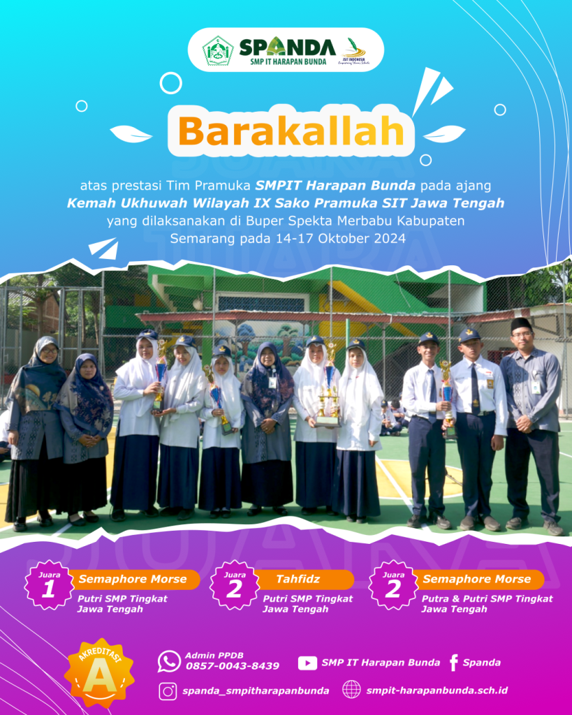 Barakallah atas prestasi Tim Pramuka SMPIT Harapan Bunda Semarang pada ajang Kemah Ukhuwah Wilayah IX Sako Pramuka SIT Jawa Tengah yang dilaksanakan di Buper Spekta Merbabu Kabupaten Semarang pada 14-17 Oktober 2024