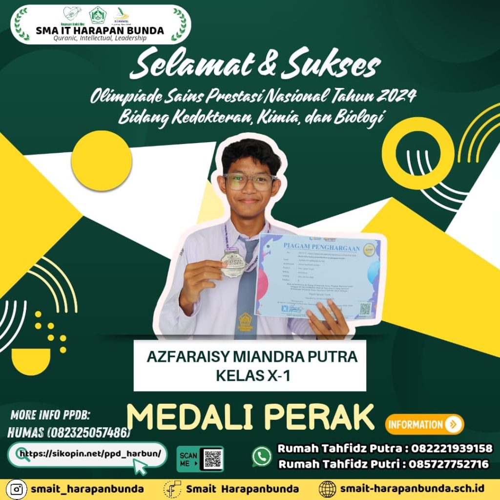 Prestasi Th 2024 Leave a Comment / Semua Prestasi, Siswa / By Humas Ybi Assalamualaikum Wr WbBarakallah Fiikum kepada ananda yang telah meraih :Mendali PerakAzfaraisy Miandra Putra ( kelas X-1 )Olimpiade Sains Prestasi Nasional Tahun 2024Bidang Kedokteran, Kimia, dan BiologiSemoga prestasi yang diraih dapat menginspirasi siswa-siswi SMAIT Harapan Bunda Semarang untuk semakin bersemangat untuk berprestasi. AamiinWassalamualaikum Wr Wb