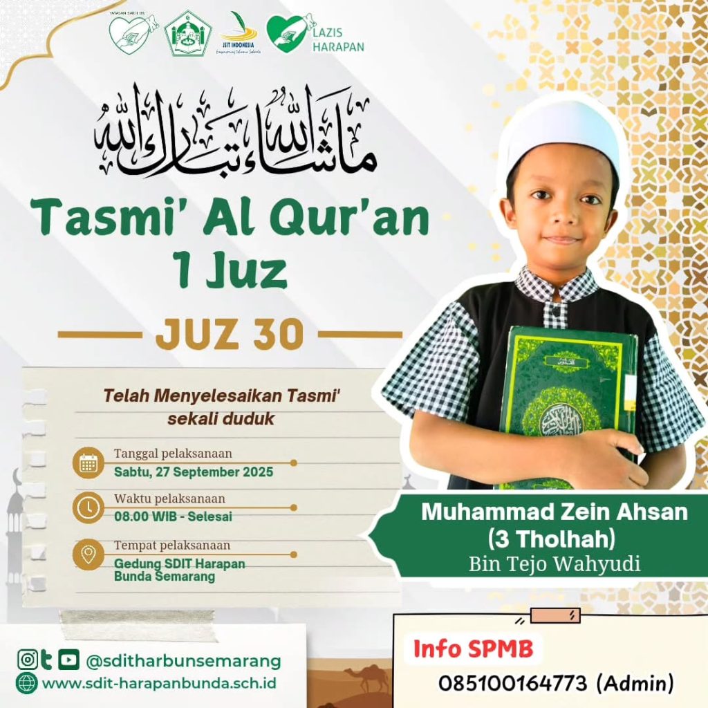 Prestasi Th 2025 Leave a Comment / Semua Prestasi, Siswa / By Humas Ybi Barokallah AnandaMuhammad Zein Ahsan Kelas 3 Tholhah yang sudahmenyelesaikan Tasmi’ Al-Qur’an Juz 30 sekali duduk.Sabtu, 27/09/2025.