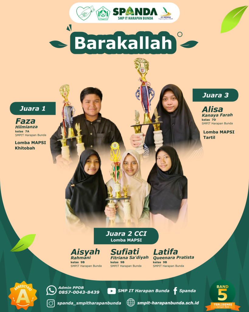 Prestasi Th 2025 Leave a Comment / Semua Prestasi, Siswa / By Humas Ybi Barokallah para juaraSMPIT Harapan Bunda Semarang@spanda_smpitharapanbunda Semoga dimudahkan dan Allah berikan hasil terbaik Hayo, ingin bakat minat kalian tersalurkan dengan tepat? Mari asah kemampuan bakat minat kalian di SMP IT Harapan Bunda. Jangan lupa SPMB INDEN SMP IT Harapan Bunda Sudah BUKA!!!!