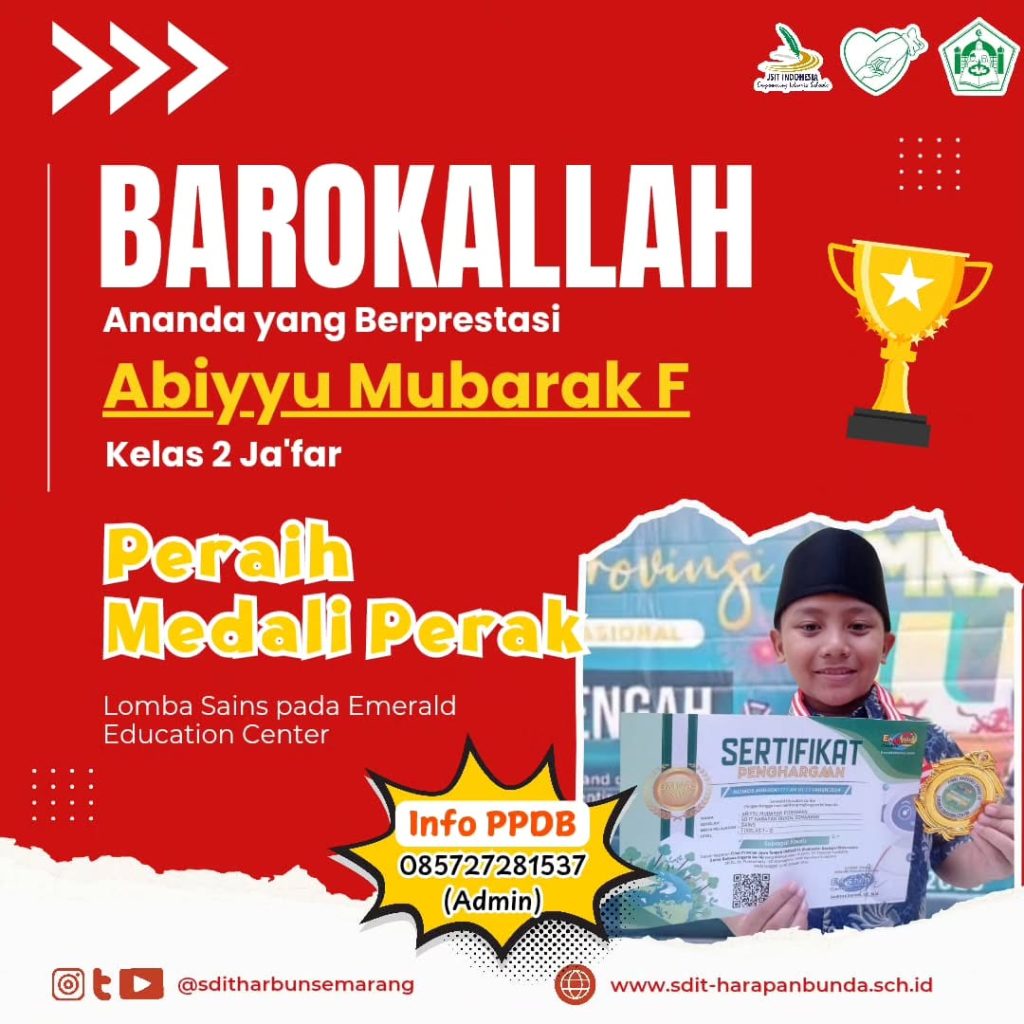 Prestasi Th 2025 Leave a Comment / Semua Prestasi, Siswa / By Humas Ybi Assalamualaikum Wr WbBarakallah Fiikum kepada ananda yang telah meraih :Mendali PerakAbiyyu Mubarak F (kelas 2 Ja’far)Lomba Sains pada Emeraid Education CenterSemoga prestasi yang diraih dapat menginspirasi murid-murid SDIT Harapan Bunda Semarang untuk semakin bersemangat untuk berprestasi. AamiinWassalamualaikum Wr Wb