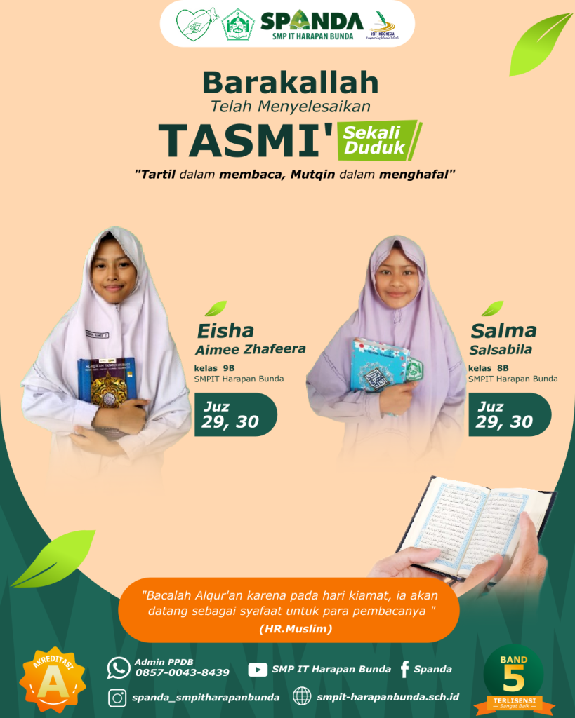 Prestasi Th 2025 Leave a Comment / Semua Prestasi, Siswa / By Humas Ybi 🏆INFO PRESTASI SPANDA 2025-2026🏆@spanda_smpitharapanbunda_Assalamualaikum Wr Wb_Barokallah Fiikum kepada ananda yang telah menyelesaikan Tasmi’ sekali duduk :🌟 Tasmi’ Juz 29,30Eisha Aimee ZhafeeraKelas 9B🌟Tasmi’ Juz 29,30Salma SalsabilaKelas 8BSemoga prestasi yang diraih dapat memotivasi siswa-siswi SPANDA untuk semakin bersemangat dalam menghafal Al-Quran _Aamiin__Wassalamualaikum Wr Wb_