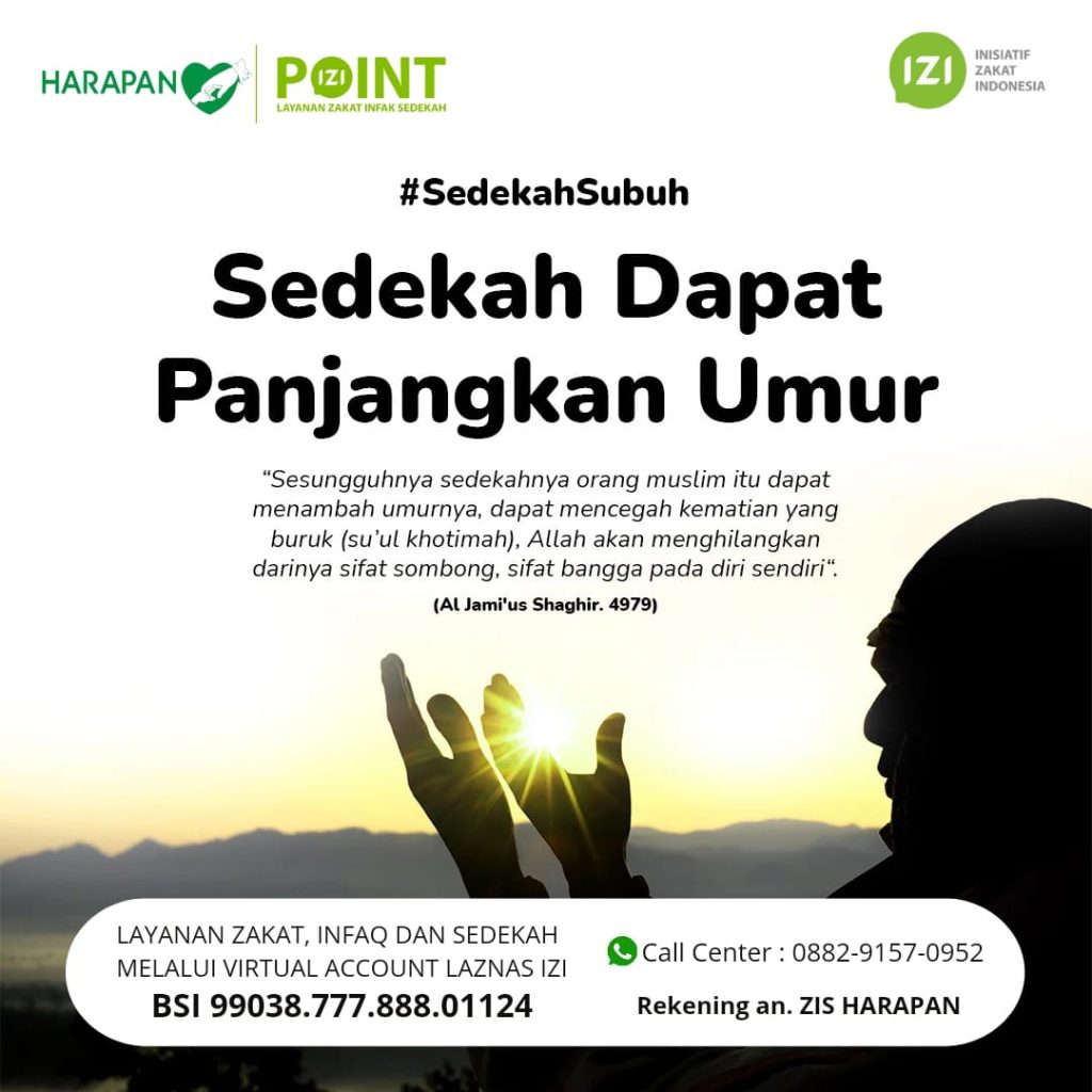 Sedekah Dapat Panjangkan Umur Leave a Comment / Berita, KB TK, LAZISHA, RUMAH TAHFIDZ, SD, SMA, SMP / By Humas Ybi “Sesungguhnya sedekahnya orang muslim itu dapat menambah umurnya, dapat mencegah kematian yang buruk (su’ul khotima), Allah akan menghilangkan darinya sifat sombong, sifat bangga pada diri sendiri.”(Al Jami’us Shaghir. 4979)