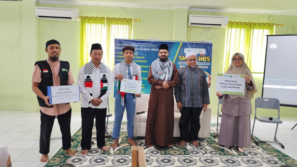 Hari Senin, 17 Ramadan 1446 H, SMAIT Harapan Bunda mengadakan kegiatan Peduli Palestina. Kegiatan ini diawali dengan taujih dari Syaikh Muhammad bin Raed. Beliau merupakan seseorang yang besar di Palestina. Beliau menyampaikan mengenai keadaan di sana dan pentingnya untuk senantiasa berinteraksi dengan Al Qur’an, terutama menghafalnya. Acara dilanjutkan degan pengumpulan dan penyerahan donasi untuk Palestina. Alhamdulillah SMAIT Harapan Bunda bisa mengumpulkan Rp 5.000.000,- untuk donasi Palestina dan akan disalurkan melalui Laziz Harapan.