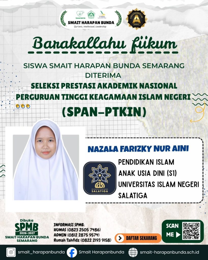 Barakallahu fiikum kepada Nazala Farizky Nur Aini kelas XII-2 yang diterima pada prodi Pendidikan Islam Anak Usia Dini pada UIN Salatiga melalui Seleksi Prestasi Akademik Nasional Perguruan Tinggi Keagamaan Islam Negeri (SPAN-PTKIN) Semoga menjadi langkah awal menuju masa depan gemilang. SPMB SMAIT Harapan Bunda MASIH DIBUKAYuk segera daftar dan dapatkan benefitnya sebelum kehabisan. Dapatkan potongan SPI hingga …