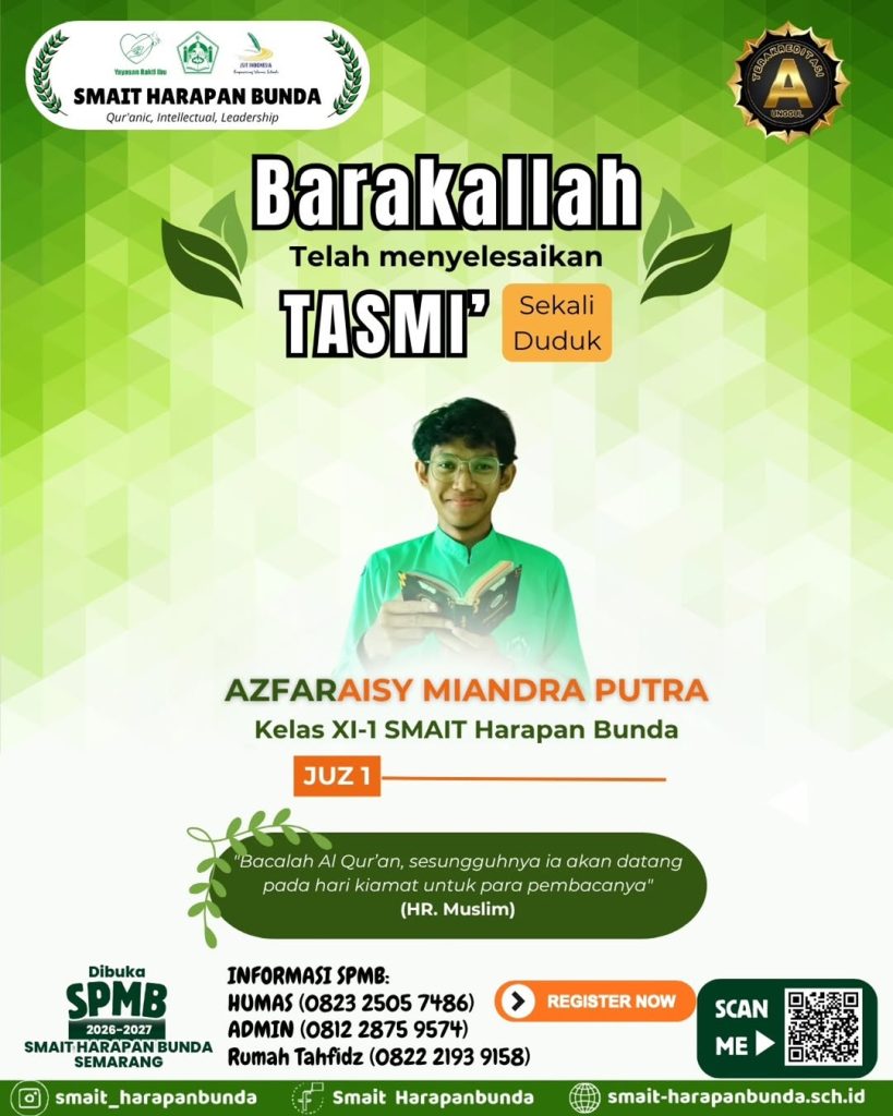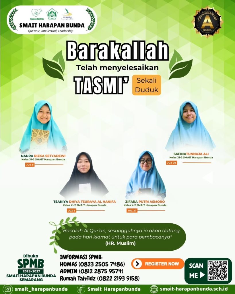 Barakallah untuk para siswa yang sudah menyelesaikan tasmi sekali duduk 1 juz. Semoga hafalan Alqurannya terjaga dan terus bertambah. Mau menjadi penghafal Qur’an seperti kakak-kakak dari SMAIT Harapan Bunda? Yuk bergabung menjadi santri Rumah Tahfidz Nurul Qur’an dan bersekolah di SMAIT Harapan Bunda Semarang. Program unggulan Rumah Tahfidz Nurul Qur’an adalah Tahsin dan Tahfidzul Qur’an. …