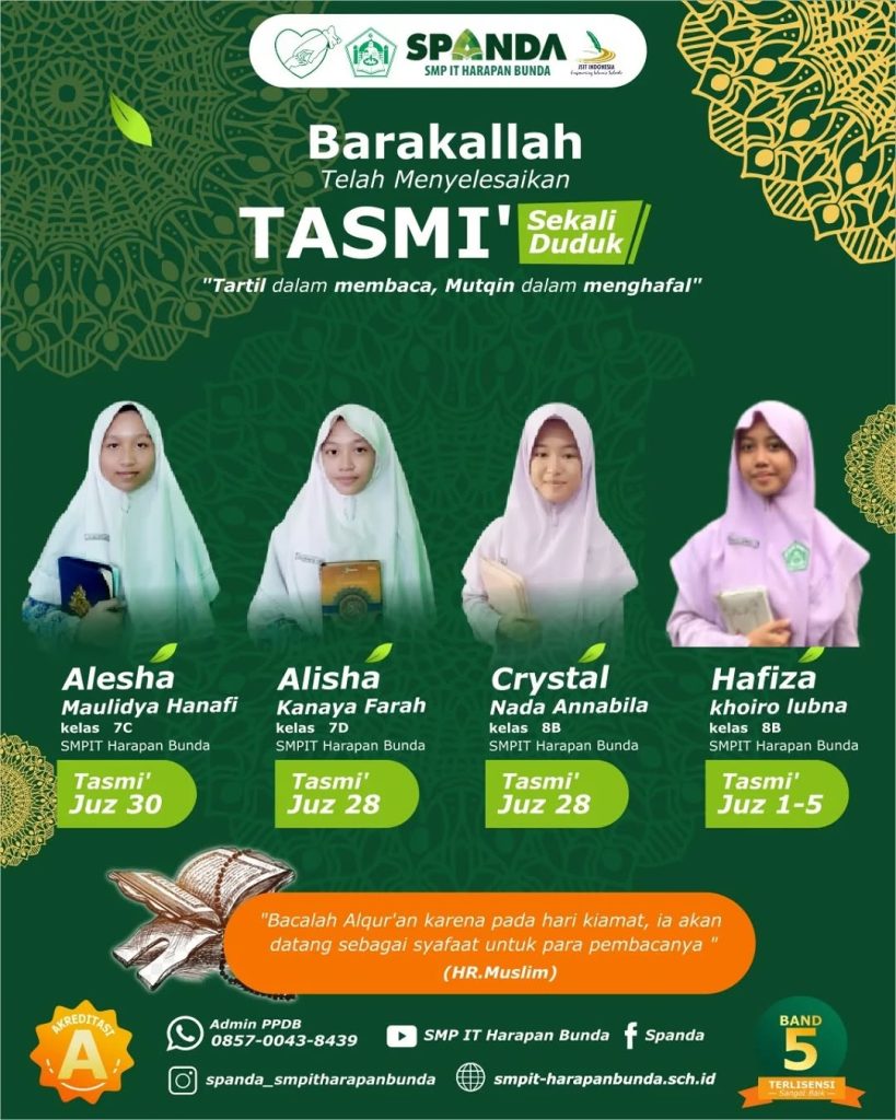 _Assalamualaikum Wr Wb_ Barokallah Fiikum kepada ananda yang telah menyelesaikan Tasmi’ sekali duduk : 🌟Tasmi’ Juz 30Alesha Maulidya HanafiKelas 7C 🌟Tasmi’ Juz 28Alisha Kanaya FarahKelas 7D 🌟Tasmi Juz 28Crystal Nada AnnabilaKelas 8B 🌟Tasmi’ Juz 1-5Hafiza Khoiro LubnaKelas 8B Semoga prestasi yang diraih dapat memotivasi siswa-siswi SPANDA untuk semakin bersemangat dalam menghafal Al-Quran _Aamiin_ _Wassalamualaikum Wr …